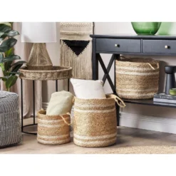 Set van 2 gevlochten opbergmanden. Deze twee mandenset van hoogwaardig katoen past in elke ruimte. In de woon- of slaapkamer biedt hij plaats aan extra kussens en dekens, in de kinderkamer is hij perfect om speelgoed in op te bergen en in de badkamer of kleedkamer doet hij dienst als wasmand. Door de neutrale kleuren past hij naadloos in elke interieurstijl. Voor meer gebruiksgemak kunnen de manden in een wasmachine worden gereinigd.